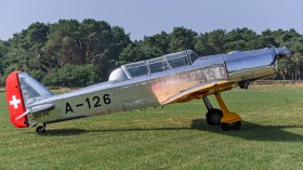 The tandem-seat Pilatus P-2 trainer was the first production aircraft of the Swiss company of the same name. It was powered by an Argus As 410A-2 V-12 inverted piston engine, reaching a maximum speed of 340 km/h. 51 machines (+ 4 prototypes) were built in two series, one (P-2-05) unarmed and the second (P-2-06) equipped with a machine gun above the engine and wing racks for light bombs and rockets, dedicated for weapon training. They served in the Swiss Air Force between 1946 and 1981. Afterwards, most of the surviving aircraft (48?) were sold to civilian customers. The P-2-05 aircraft with serial number 46, captured at the home airfield of Balen-Keiheuvel, is offered for sale on the Internet for € 180,000. It was built in 1948 and has flown 1,826 hours.